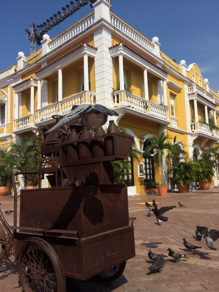 Pigeons gather in front of one of Cartagena’s old colonial buildings.