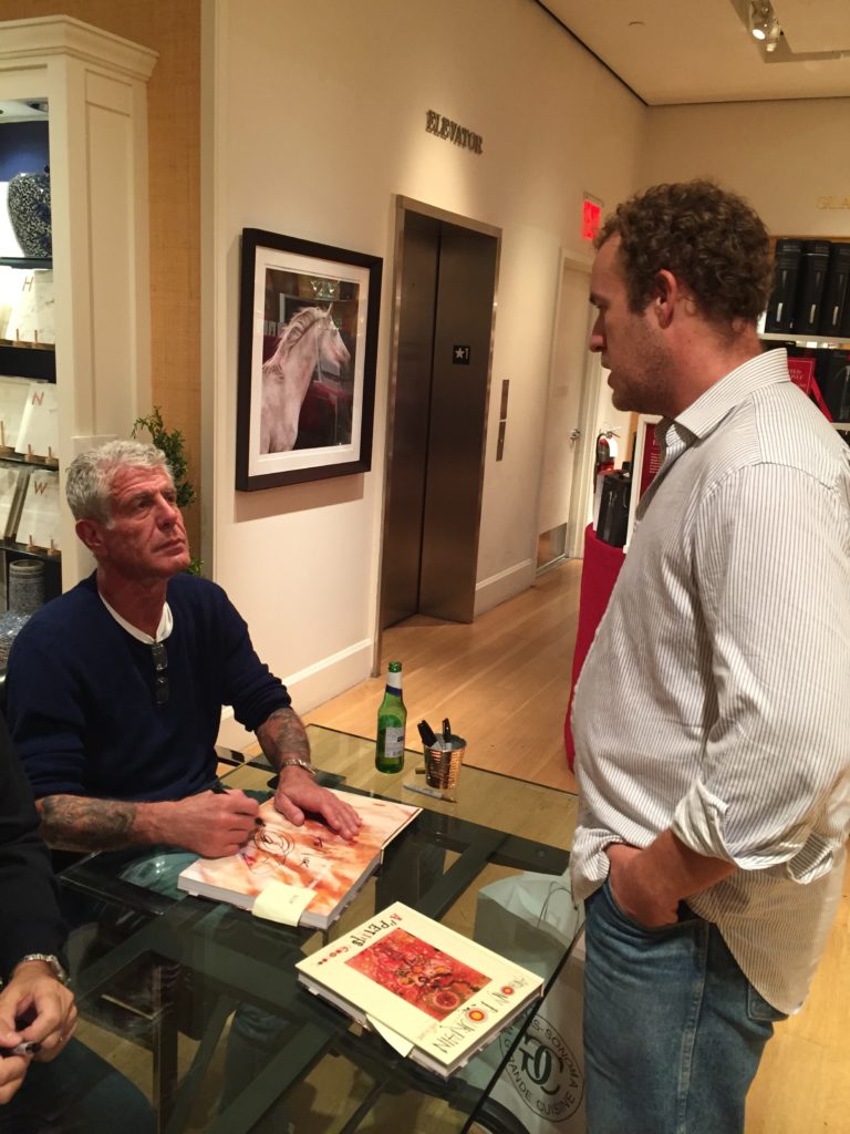 I met him one time, about a year and a half ago. In a Williams and Sonoma of all places. My brother surprised me, saying there was a travel writer he wanted me to meet. Anthony Bourdain was there, doing a book signing. The line snaked around the store and led to his table, where one person after another got him to sign a copy of their just-purchased book, then went around behind him and posed for their photo with him, taken by a professional photographer standing there and lining up the shots. It reminded me of a department store Santa setup.